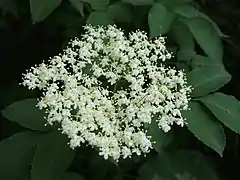 Arbusto perenne, crece 2–3 m de altura, hasta 5; tallos erectos, usualmente sin ramas, en grandes grupos por un extendido y perenne sistema de rizomas subterráneos. Hojas opuestas, pinnadas, 15–30 cm de long., 5-9 folíolos con aroma fétido. Los tallos terminan en un corimbo de 10–15 cm de diámetro con numerosas flores blancas (ocasionalmente rosas). Fruto baya tóxica, negra, pequeña, globosa de 5–6 mm de diámetro.