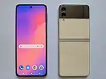 El Samsung Galaxy Z Flip y Z Flip 5G se lanzaron el 14 de febrero de 2020 y el 7 de agosto de 2020 respectivamente, y fue el primer dispositivo comercializado con la marca "Z".[1] A diferencia del Galaxy Fold, el dispositivo se pliega verticalmente y utiliza un revestimiento de vidrio híbrido con la marca "Infinity Flex Display".[5][6][7]