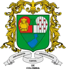 En el cuartel superior izquierdo, sobre argent, hay 7 cerezas de café, en gules, que forman filas verticales; las cerezas significan la producción agrícola del municipio. En el cantón inferior sobre sínople, color de praderas, valles, bosques y cordilleras, está el río Magdalena, en argent, con el sitio del estrecho, belleza natural donde las rocas estrechan el río y el canal rocoso queda reducido a 2,17 metros de ancho. Enmarcan el escudo lambrequines en forma de hojuelas de acanto en oro. Una cinta en argent, en la base, lleva esta inscripción: "San Agustín Capital Arqueológica".[7]