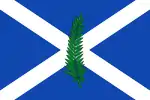 Bandera apaisada, de proporciones dos de alto por tres de largo, azul, con una cruz de San Andrés llena con brazos de ancho de 1/6 del alto de la bandera, de color blanco. En medio y puesta en palo, una palma de altura de 7/9, de color verde.»[7]