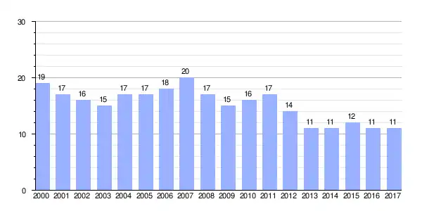 Gráfica de evolución demográfica de San Bartolomé de Rueda[2] entre 2000 y 2017 |