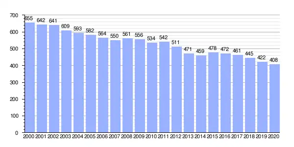 Gráfica de evolución demográfica de San Claudio entre 2000 y 2020 |
