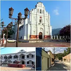 ![]() En la parte superior iglesia colonial del municipio, en la parte inferior palacio municipal y fotografía de una calle de la localidad