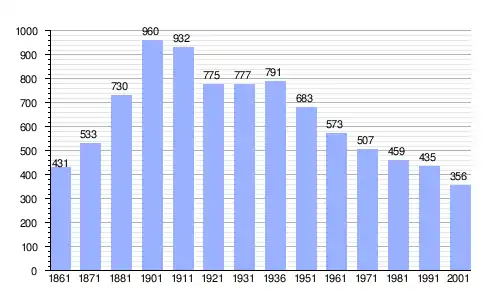 Gráfica de evolución demográfica de San Giacomo Vercellese entre 1861 y 2001 |
