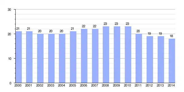 Gráfica de evolución demográfica de San Justo de las Regueras[2] entre 2000 y 2014 |