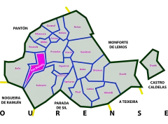 Limita con las parroquias de Rosende al norte, Anllo al oeste, Proendos y Figueiroá al este y Bolmente al sur. También limita por el sur con el municipio orensano de Nogueira de Ramuín, del que está separada por el río Sil.
