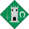 - «Escudo embaldosado: de sinople, una torre de plata cerrada de sable acostada de una espada de plata a la diestra y de una herradura de plata a la siniestra.»[6]