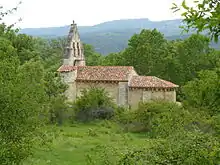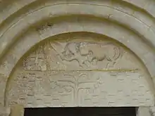 La portada, opuesta al ábside, cuenta con un relieve de San Miguel enfrentándose a un monstruo,[7] representación de la lucha del Bien contra el Mal, y otro del Árbol del Bien y del Mal.[3] Los capiteles de la portada muestran leones y águilas.[7] Sobre la portada se erige una espadaña.[7]