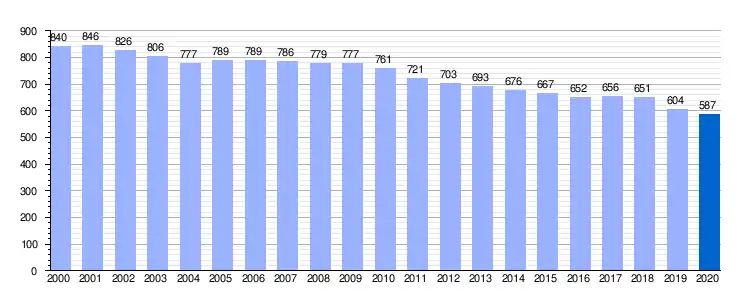 Gráfica de evolución demográfica de San Miguel de las Dueñas entre 2000 y 2020 |