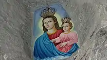 La imagen que hoy adorna el santuario está basada en una copia fotográfica del cuadro de Isaac Santacruz, con unas adaptaciones hechas por el mismo pintor Patuso Santacruz. Ahí aparece la Virgen de medio cuerpo con el Niño en brazos, pero sin mirar hacia el abismo y sin el rosario como en la pintura original. Esta decisión se tomó durante la vigencia del padre Francisco Mora, terminando la década de 1960, la determinación se realizó en cuanto la imagen primaria ya no era visible.