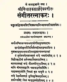 El primer capítulo tiene ocho secciones. Se abre con versos reverenciales al dios hindú Shiva, que es llamado «la encarnación del sonido, cantado por todo el mundo» y el que deleita según los Vedas.[19] El autor rinde homenaje a sus antepasados, luego a los antiguos eruditos como Bharata Muni, Matanga, Dattila y Narada, así como a los principales dioses y diosas del hinduismo en la primera sección del primer capítulo. En la segunda sección, apenas se menciona la música o la danza, sino que Sarangadeva presenta sus creencias metafísicas y fisiológicas, y atribuye el origen de la música a los Sāmaveda.[19][20] Presenta temas musicales y definiciones de conceptos musicales a partir de la sección tres del primer capítulo, con frecuentes menciones a Shiva y a la diosa hindú Sarasvati.[19]