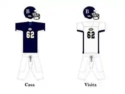 ![]() Logo Uniforme de Visita ![]() Logo Uniforme de Casa Los BULLDOGS visten 2 uniformes, cascos color Azul Marino con una "B" estampada en el lado del mismo. Uniforme de visita, consiste en un jersey blanca con números impresos en Blanco y Dorado, pantalones blancos y medias Azul Marino. Para juegos de casa, jersey azul marino con números en blanco y dorado, pantalón blanco y medias Azul Marino. |