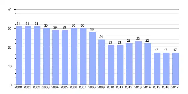 Gráfica de evolución demográfica de Santa Colomba de las Arrimadas[2] entre 2000 y 2017 |