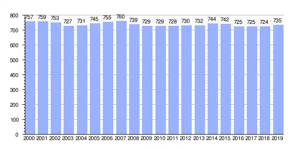 Gráfica de evolución demográfica de Ribadulla entre 2000 y 2019 |