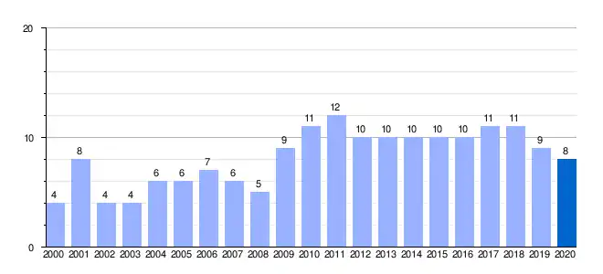 Gráfica de evolución demográfica de Santa Cruz de los Cuérragos[8] entre 2000 y 2020 |