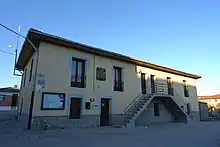 El escudo municipal es partido. Primero, en gules, arco gótico florido, cobijando columna con base y capitel corintio, en oro; al jefe, puestos en faja, tres bezantes de oro. Segundo, en azur, lienzo de espadaña, de plata, de dos cuerpos, con tres campanillas, puestos uno y dos a su color; surmontada de hoz de plata cargada con tres espigas de oro. En punta, de plata, onda azur. Al timbre corona real cerrada.[2]