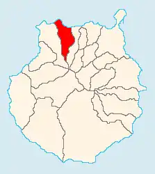 Emplazada en el norte de Gran Canaria a 22 kilómetros de la capital de la isla, con una forma triangular que sitúa su vértice superior hacia el sur en las cercanías de la caldera de los Pinos de Gáldar. Hacia el Este limita con el municipio de Moya definido por el Barranco de Moya hasta su desembocadura. Por el Oeste, la división sigue algunos cauces, rodea el Pico de La Atalaya o montaña de Gáldar, y continúa hasta la costa, dividiendo en dos el Pico de la Atalaya. Al norte limita con el Océano Atlántico.