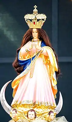 La talla, de aproximadamente 73 cm de altura y cerca de 22 kilos de peso, está realizada en madera de molave (considerada la mejor de Filipinas)[8] a excepción de la cabeza y las manos, las cuales están talladas en marfil, siendo la peluca de cabello natural y la vestimenta de color rosa, azul y dorado. A sus pies destaca una media luna plateada sobre una nube dorada ornamentada con las cabezas aladas de tres ángeles. La talla posee así mismo dos coronas, una de ellas realizada con piezas de oro donadas por Ana Martínez Underwood en agradecimiento por el regreso de su esposo, quien le había dado las joyas como regalo de bodas, de un campo de prisioneros tras el fin de la Segunda Guerra Mundial.[4]