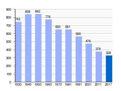 Población de derecho (1900-1991) o población residente empadronada (2001 y 2011) según los censos de población del INE.[12] Población según el padrón municipal de 2017 del INE. |