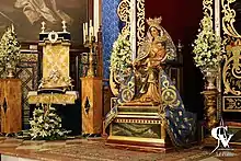 La Señora aparecía candorosamente sentada en su trono, representando iconográficamente a una Reina que nos presenta a su hijo como Rey del universo. Luce traje en tonos áureos de estilizada estampación floral y manto de color verdoso, sobre oro bruñido y esgrafiado con formas vegetales y ancha fimbra que lo bordea. Los pliegues del vestido se ciñen a la cintura con un cordón e imprimen cierta simetría y frontalidad. Esta elegante pose queda subrayada con el manto cuyas sinuosas líneas dulcifican los volúmenes de derecha a izquierda sobre la falda. Destaca el detalle del pie izquierdo de María que reposa sobre un cojín imprimiendo a la composición una acertada ruptura de la frontalidad.