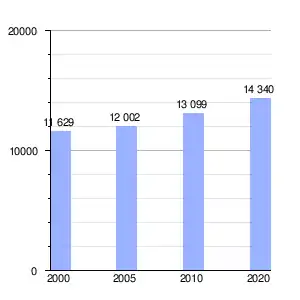 En 2020 el 46.7% de la población (6694 personas) eran hombres y el 53.3% (7646 personas) eran mujeres. El 64.1% de la población, (9162 personas), tenía edades comprendidas entre los 15 y los 64 años.[5]