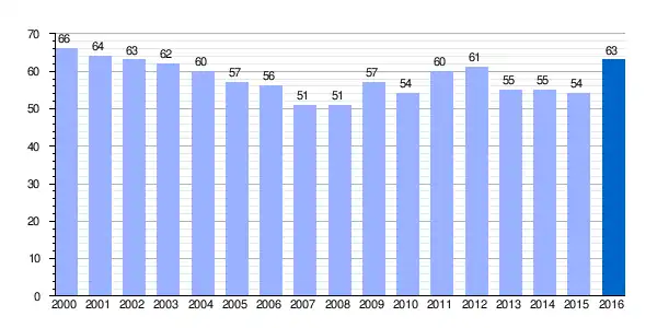 Gráfica de evolución demográfica de Santa Olaja de Eslonza[2] entre 2000 y 2016 |