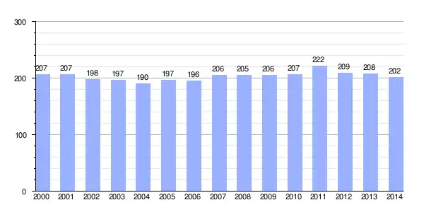 Gráfica de evolución demográfica de Santa Olaja de la Ribera[2] entre 2000 y 2014 |