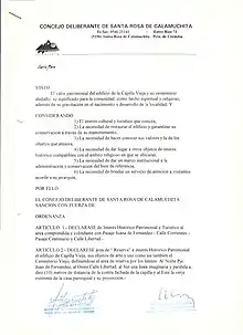 - Ordenanza del Concejo Deliberante de Santa Rosa de Calamuchita, 29 de Noviembre de 2014