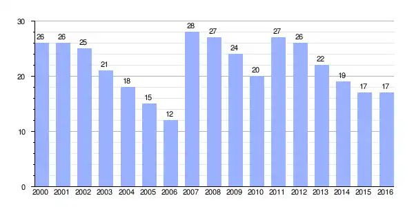 Gráfica de evolución demográfica de Santalavilla[2] entre 2000 y 2016 |