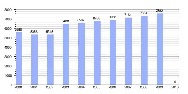 Gráfica de evolución demográfica de Jubia entre 2000 y 2010 |