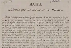 - Biblioteca Luis Ángel Arango (1841). Acta celebrada por los habitantes de Popayán en Sección Sala de libros raros y manuscritos, número topográfico HSI0202. Bogotá: Banco de la República.