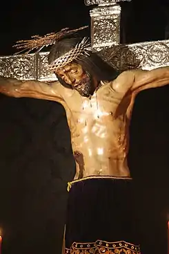 Es una obra simétrica, concepto muy propio de la época en que fue realizada, el Renacimiento, salvo por la inclinación diestra que presenta la cabeza, que muestra a Jesús después de expirar. El rostro refleja visiblemente el dolor y cansancio de Cristo, sobrevenido sobre su propio peso. Sobre la zona pectoral vemos tres regueros de sangre y en el costado derecho la herida de la lanza de Longinos, representada con una mancha negruzca y una pequeña perforación del cuerpo. Al estar tallada íntegramente, su anatomía se cubre con un sudario corto de tela, bien con faldilla o tonelete.