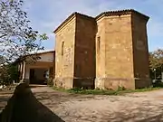 Arquitectónicamente, destacan las dos portadas románicas: la occidental, que está situada sobre un cuerpo saliente del edificio, y la orientada al sur, de menores dimensiones. La puerta principal, con su «arco del triunfo», tiene tres arquivoltas y tres columnas a cada lado de la puerta con sus correspondientes capiteles. En el muro en el que están las puertas destacan los sillares muy bien escuadrados, algo extraño en aquella época, en la que solo se ponía más interés en las partes fundamentales de soporte de la estructura, como son esquinas, columnas soporte de techo, etc.[19]
