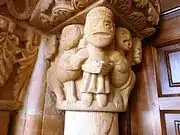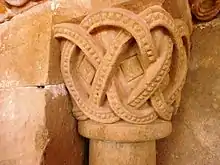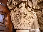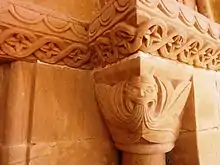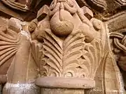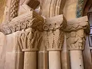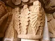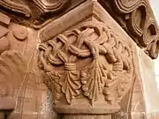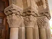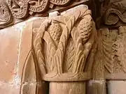 El capitel de la parte derecha de la puerta representa una cabeza que más bien parece humana, que está comiéndose unas grandes hojas que ocupan casi toda la cesta y que se dividen en dos especies de ramas que se voltean hacia la parte superior del capitel, hasta la altura de la cabellera del ser que se las come. El capitel de la parte izquierda está formado por unas cintas ampliamente enlazadas y trenzadas. A todo lo largo de ellas y en su parte central tiene una especie de perlas o adornos cuadrados. Todo este trabajo está en altorrelieve sobre un fondo en el que aparecen tres rombos casi cuadrados. Es un capitel de gran belleza artística y geométrica, aunque se desconoce el significado.[21]