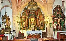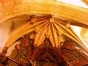 En el interior, la nave se separa de la entrada por un arco románico de doble arquivolta con motivos en zigzag que se apoya sobre columnas con capiteles decorados. La nave tiene una cubierta de madera y la de la cabecera es una bóveda nervada estrellada; la sacristía está cubierta con bóvedas nervadas baídas. Hasta finales del siglo XVII, en el que fue derribada parte del templo, el arco triunfal comunicaba directamente con la única nave y el ábside. Este arco tenía tres arquivoltas semicirculares que se apoyaban en plintos o pedestales, que son elementos en forma de paralelepípedo dispuestos bajo la basa, que es la parte inferior de la columna que tiene como fin servir de punto de apoyo al fuste de la columna o de la pilastra, formando parte de ella, generalmente apoyada en el suelo.[21]