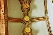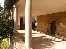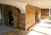 La segunda arquivolta está decorada en su totalidad por «rollos o lóbulos zamoranos» cerrados, que tienen como característica principal el que se emplearon por primera vez en la Portada del Obispo de la Catedral de Zamora,[22] que tiene las cuatro arcadas con rollos, por lo que suelen llamarlos así. Sin embargo, para otros especialistas en la materia, como son Gudiol y Gaya Nuño, este tipo de decoración ya había sido utilizada en un arco de la Mezquita de Córdoba; algún otro lo fecha en épocas mucho más anteriores, como Chueca Goitia, que lo vincula a decoraciones sirias.[23] Junto a la vieja mezquita arábiga de Huesca[24] se alzaba en el siglo XII la pequeña iglesia románica dedicada a Santa María de los Gozos, de la que queda un pórtico compuesto por tres arquivoltas con rollos exentos en su intradós.[25] Se pueden encontrar en zonas más próximas en las iglesias de San Esteban de Aramil, Santa Eulalia de Ujo y San Esteban de Ciaño. En el siglo XIX se le añadió un pórtico de columnas que rodea a la iglesia a modo de atrio por las fachadas que dan al sur y a occidente, fundamentalmente por las cuestiones meteorológicas adversas que sufren las zonas norte u oriental.[16]
