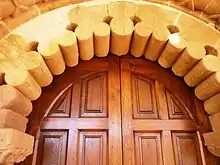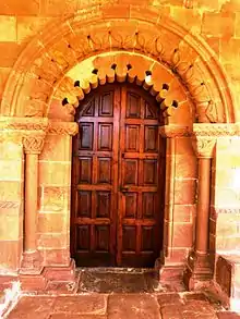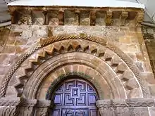 Las tres arquivoltas semicirculares —que también en este caso estaban protegidas por guardapolvo— se apoyaban en columnas que, a su vez estaban sobre plintos. La primera, es decir, la más exterior, estaba decorada con el motivo geométrico del zigzag; la segunda o intermedia disponía de molduras aboceladas, que tiene forma de bocel, consistente en una moldura convexa lisa, de sección semicircular, y una cenefa adornada con motivos vegetales; la tercera rosca o arquivolta no tenía adornos de ningún tipo.[18]