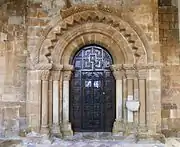 El diseño estructural de la puerta principal a occidente está formado por tres arquivoltas de medio punto. La arquivolta exterior está decorada con motivos geométricos en zigzag, la arquivolta intermedia está decorada con unos dibujos que asemejan cañas, y la tercera o interior está compuesta por veintiséis círculos de pequeño tamaño, donde se inscriben hojas cuadrifolias simétricas pero giradas unos grados las de cada círculo respecto a los siguientes. Se apoyan sobre impostas y tres pares de columnas con capiteles decorados con motivos vegetales y de figuras. Todas las arquivoltas están protegidas por un guardapolvo superior semicircular compuesto por tres filas de tacos lisos al tresbolillo y un tejaroz recto y horizontal en la parte superior, sostenido por nueve canecillos separados por tacos con figuras geométricas. Dos canecillos tienen forma zoomórfica: uno representa la cabeza de un animal felino y el otro a un cuadrúpedo. Otros canecillos tienen figuras vegetales o geométricas muy diferentes. Entre ellos, y a modo de separación, hay unos tacos con figuras circulares e, inscritas en cada círculo, otras figuras casi geométricas en forma radial al círculo. En la parte derecha de la puerta tiene una pila de agua bendita de piedra entre la columna intermedia y la exterior, hecha de una sola pieza, pero de ejecución muy posterior a las columnas de la portada.[20] En la portada, en la parte izquierda, se pueden distinguir dos escenas de la Virgen: una es la Presentación de Jesús y Purificación de la Virgen, y la otra es la Visitación de la Virgen a su prima santa Isabel.[8]