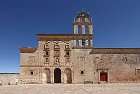 Cuenta con una fachada austera de sillares. En el centro del dintel de la puerta izquierda se encuentra un escudo, en medio relieve, con el corazón agustino. En el piso bajo se abren, a continuación, tres vanos rectangulares; por encima corre un primer y único piso, donde se abren diez vanos rectangulares y un óculo pequeño. Como coronamiento presenta una cornisa que discurre por toda la fachada, en moldura de cuña reversa.