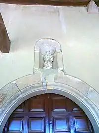 Ambas fachadas, oeste y sur, tienen un pórtico que se apoya en pilares cuadrados sobre un murete. La fachada sur es más sencilla que la principal, consistiendo en un arco de medio punto y por encima una hornacina con la imagen de la «Virgen Niña» que es conocida popularmente por «La Perezosa», pues al decir popular en clave de simpatía y anecdótica, llegó tarde y se quedó fuera. En la fachada principal, la sur, hay una imagen de la Virgen reposando sobre la luna con floreros a ambos lados, rodeada por un rosario y una epigrafía en la parte inferior que dice «Nuestra Señora de los Remedios», todo ello grabado en una piedra de granito rojo. La misma imagen, solo que con una pequeña diferencia, la de tener una paloma en su lado derecho y en la luna, que también aparece, está un ángel con la cabeza reposada en ella, se encuentra en una casa cercana conocida como «el mesón».