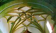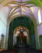 El templo, de gran solidez y monumentalidad, tiene planta de cruz latina, presbiterio rectangular con bóvedas estrelladas y nervios muy pronunciados. La crucería es de una gran belleza tanto en estructura como en detalles. La fachada que da a occidente tiene dos pares de columnas jónicas que soportan un frontis triangular de molduras gruesas. La puerta principal, en su fachada sur, es de medio punto y de corte renacentista,[7] abriéndose en el centro una portada de arco de medio punto, cuyas claves e impostas resaltadas están cubiertas por tejeros de piedra.[8] La fachada lateral es bastante más sencilla pero tiene una hornacina de la Virgen con el Niño en su parte superior.[9][10] Lo más destacable de la edificación es su portada, que es una imitación, ruralizada, de la San Vicente de Oviedo y que es de los pocos modelos importados de Italia en el siglo XVI y que, según asegura Torga Llamedo, es muy probable que su autor sea Domingo de Mortera (1560-1608).