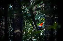 ![]() Gallito de las rocas en el Santuario Nacional Pampa Hermosa. | ||