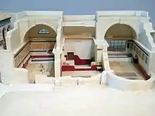 Las termas pequeñas, construidas en forma de “L” cierran el conjunto termal por el sud-este. Presentan una ordenación similar a la de las termas mayores, con basílica thermarum, frigidarium-apodytherium, tepidarium, caldarium y dos praefurnia, aunque incorpora una sala nueva e innovadora para la época como la piscina cálida,una especie de piscina cubierta y climatizada. En ambos edificios termales, el pavimento de las salas calefactadas aparece suspendido sobre el hypocaustum, cámara subterránea realizada mediante galerías de arcos de ladrillos por donde pasa el aire caliente procedente de los hornos del praefurnium, que a través de las cámaras de las paredes realizadas con piezas cerámicas, la concameratio, sale al exterior a través de chimeneas.