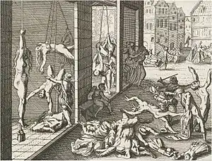 ![]() El ayuntamiento de Amberes ardiendo durante el saqueo de la ciudad por tropas españolas en 1576. | ||||