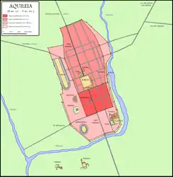 Después de cruzar los Alpes Julianos, la primera ciudad sitiada fue Aquilea romana, la metrópoli de Venecia e Histria.[6] En el lado este, las murallas estaban bañadas por el río Natissa.[6] El historiador Giordane dice que el asedio duró mucho tiempo pero Paolo Diacono dice que incluso tres años, pero un asedio de tres años parece improbable, incluso considerando que la invasión de Italia tuvo lugar en un año, debido a la fuerte resistencia de la guarnición romana, y que el ejército húngaro estaba ahora desmoralizado y a punto de renunciar al asedio.[7][8][9] El propio Jordán narra que Atila comenzó a caminar alrededor de la muralla, para reflexionar sobre si continuar el asedio o renunciar a él, cuando notó que las cigüeñas estaban sacando a sus crías de la ciudad Procopio de una torre, en contra de su costumbre.[7][8][9]