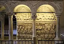 Tallado en mármol de Carrara estilísticamente data del reinado de Teodosio el Grande (fines del siglo IV).[1] El tallado presenta una composición sólida con un "gran sentido del modelado de las figuras" y una rica ornamentación.[2] El tema central de las esculturas es Jesucristo y sus apóstoles, representados con realismo y alegóricamente como doce ovejas.[3] Los paneles describen tanto escenas del Nuevo como del Antiguo Testamento que incluyen:[4]