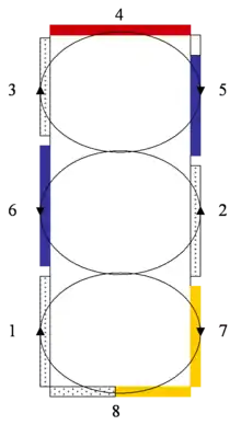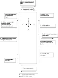 Este movimiento crea tres círculos interconectados, cada uno de ellos por un tema específico. El sacrificio es el eje de la narrativa, que se encuentra en el centro de cada una de las caras principales, y en torno a este giran las acciones de los otros dos círculos. Las dos escenas de libación de cada una están conectadas, formando una esfera al este del círculo del sacrificio. El círculo que se forma al oeste, es donde comienza y termina el viaje, y donde el fallecido o el espectador deben decidir si continuar el camino o poner fin a la historia.[41]