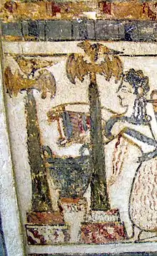 Tras esta figura se representa un pequeño elemento arquitectónico, decorado con bajorrelieve y pintura, motivos que se troncan y espirales.[17] Estos patrones son similares a los que podemos ver en el exterior del sarcófago.[18] Delante de la figura se disponen un árbol y una escalera de tres peldaños. Este elemento parece ser excepcional del arte egeo, aunque está más asociado al arte egipcio, donde las escaleras marcan claramente la transición de un lugar a otro, de un estado a otro y, por extensión, de la vida a la muerte. Charlotte Long y Roberto Paribeni concluyeron que existe un paralelismo con las costumbres egipcias de inhumación. Comparan a la extraña figura masculina con una momia dispuesta en vertical por Anubis en medio de la ceremonia egipcia de apertura de la boca.[6][19]