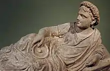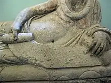 En el frente del sarcófago está tallado un medio relieve con figuras. En el centro, sin la cabeza rota por el paso del tiempo, aparece representado el propio difunto. A su izquierda y derecha hay mujeres aladas (Vanth) y hombres con martillos (charunes) que acompañaban al difunto al inframundo según las creencias etruscas. Este viaje al inframundo es un tema recurrente en sus relieves de sarcófagos y pinturas en tumbas.
