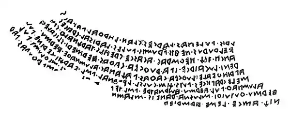 La mayoría de las palabras están separadas entre sí por un punto. Las excepciones son las secuencias de palabras IPA RUTHCVA en la línea 4 y APRINTHVALE LUTHCVA en la línea 5. AN CN no es seguro si es una palabra o dos. Después de una palabra al final de la línea, no hay ningún punto excepto para HERMU en la línea 5 y PUL en la línea 7. Las palabras SPU-RENI en la línea 3/4 y PAR-NICH en la línea 8/9 abarcan un salto de línea. Al principio, la letra A definitivamente falta en LRIS. Otras letras pueden faltar o estar mezcladas, p. Ej. B. en la última palabra HRMRIER, que a veces se lee como HERMERI.